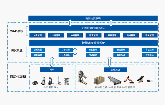 • 电网物流智能仓储解决方案以”货箱到人、货到人、订单到人“三大核心理念,融合了移动机器人(AGV)、穿梭车、输送机、提升机、移载机、拆碟盘机、自动拆码垛机器人、配套应用视频监控、RFID、 PDA 、电子拣货标签P2L等硬件设备,彻底颠覆传统的物流出入库模式,高效完成包括物料采购入库、领料出库、物料盘点等各项仓库存储业务需求
